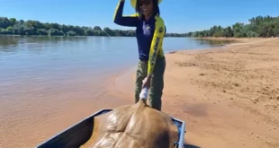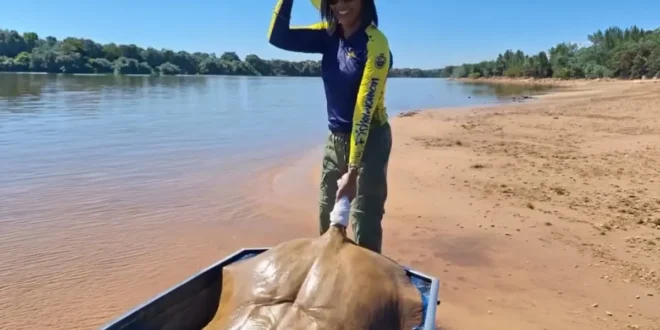 Pescadora fisga arraia gigante de 50 kg no Rio Araguaia e impressiona moradores em Goiás