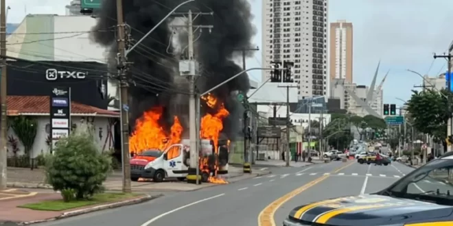 O Corpo de Bombeiros foi acionado e atua no combate às chamas. A ambulância foi completamente destruída pelo fogo.