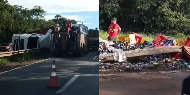 Carreta carregada de cerveja tomba na BR-060 e provoca lentidão em Anápolis