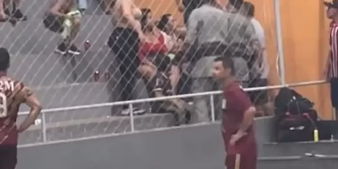 Imagens gravadas por torcedores mostram que a situação teve início quando um homem, vestindo camisa vermelha, precisou ser retirado do local pelos policiais responsáveis pela segurança do evento. Na sequência, outro suspeito teria se envolvido em uma discussão com os agentes e arremessado um capacete contra a equipe.
