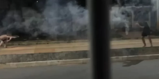 Um grupo de jovens promoveu uma “guerra” com fogos de artifício em uma área pública do Jardim Balneário Meia Ponte, na madrugada de sábado (4/4), em Goiânia. A cena foi registrada por populares e mostra os participantes lançando artefatos uns contra os outros em meio à via pública.
