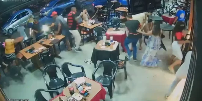 Câmeras de segurança de um bar no Jardim Belo Horizonte, em Aparecida de Goiânia, registraram a sequência completa de uma briga que terminou com um jovem de 25 anos baleado no domingo (1º). O incidente ocorreu logo após a transmissão da partida entre Flamengo e Corinthians no estabelecimento.