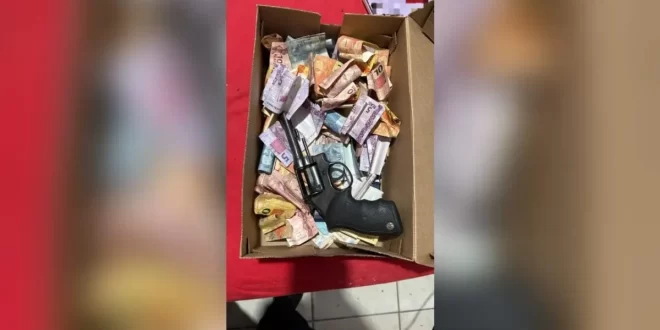 Durante as buscas, os policiais apreenderam uma arma de fogo, encontrada dentro de uma caixa com grande quantidade de dinheiro, além de documentos, celulares e computadores.