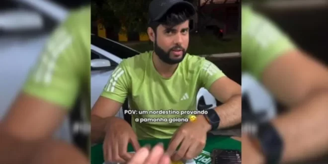 A psicóloga Isadora Duarte viralizou nas redes sociais ao registrar o momento em que um amigo nordestino experimenta a tradicional pamonha goiana pela primeira vez. No vídeo, o influenciador Thiago Solrac aparece inicialmente relutante em provar o prato típico, demonstrando estranhamento com a textura do alimento feito à base de milho.
