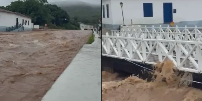 Após uma forte chuva registrada na Cidade de Goiás, o Rio Vermelho transbordou na manhã desta terça-feira (6) e provocou alagamentos, incluindo a Rua da Prefeitura. Imagens gravadas por volta das 13h pelo professor Glauco Gonçalves, da Universidade Federal de Goiás (UFG), mostram que o nível da água já havia alcançado a Ponte da Lapa, margeando a casa da poetisa Cora Coralina. A força da correnteza também chamou a atenção.