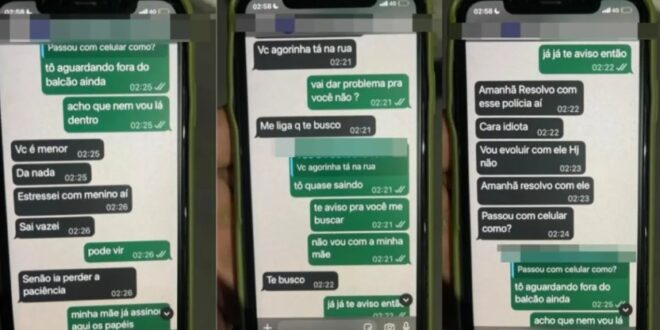 Ainda conforme a ocorrência, um homem sem farda se identificou como tenente da Companhia de Policiamento Especializado (CPE) de Catalão. Nervoso, o oficial teria segurado um sargento pelo braço e feito ameaças para que a menor fosse liberada. Após discussão, o tenente deixou o local, mas continuou enviando mensagens à adolescente, segundo o registro no celular dela, dizendo que “acertaria as contas com o sargento no dia seguinte”. O aparelho foi entregue à PM pela mãe da jovem.