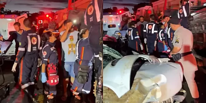 Em um dos caminhões, de cor vermelha, havia ainda um passageiro em estado grave preso às ferragens. Na mesma cabine, outra vítima foi localizada em óbito, permanecendo no local para posterior remoção pelo Instituto Médico Legal (IML).